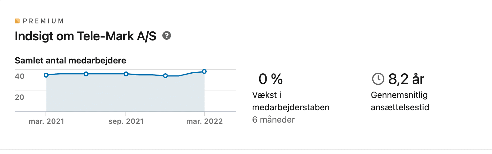 På LinkedIn er der en Premium feature, som viser indsigt om virksomheder. Her fremgår blandt andet den gennemsnitlige ansættelsestid blandt nuværende og tidligere ansatte, som er at finde på LinkedIn.