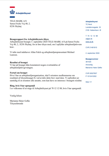 Tele-Mark A/S was recently visited by the Danish Working Environment Authority, exactly 10 years after their last inspection in August 2014. (Read more about this visit in our news from August 2014).